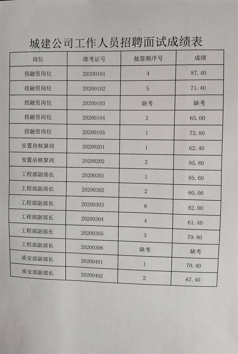 | 宜昌市點(diǎn)軍城鄉(xiāng)建設(shè)開(kāi)發(fā)有限公司2020年公開(kāi)招聘工作人員面試成績(jī)公示 |
