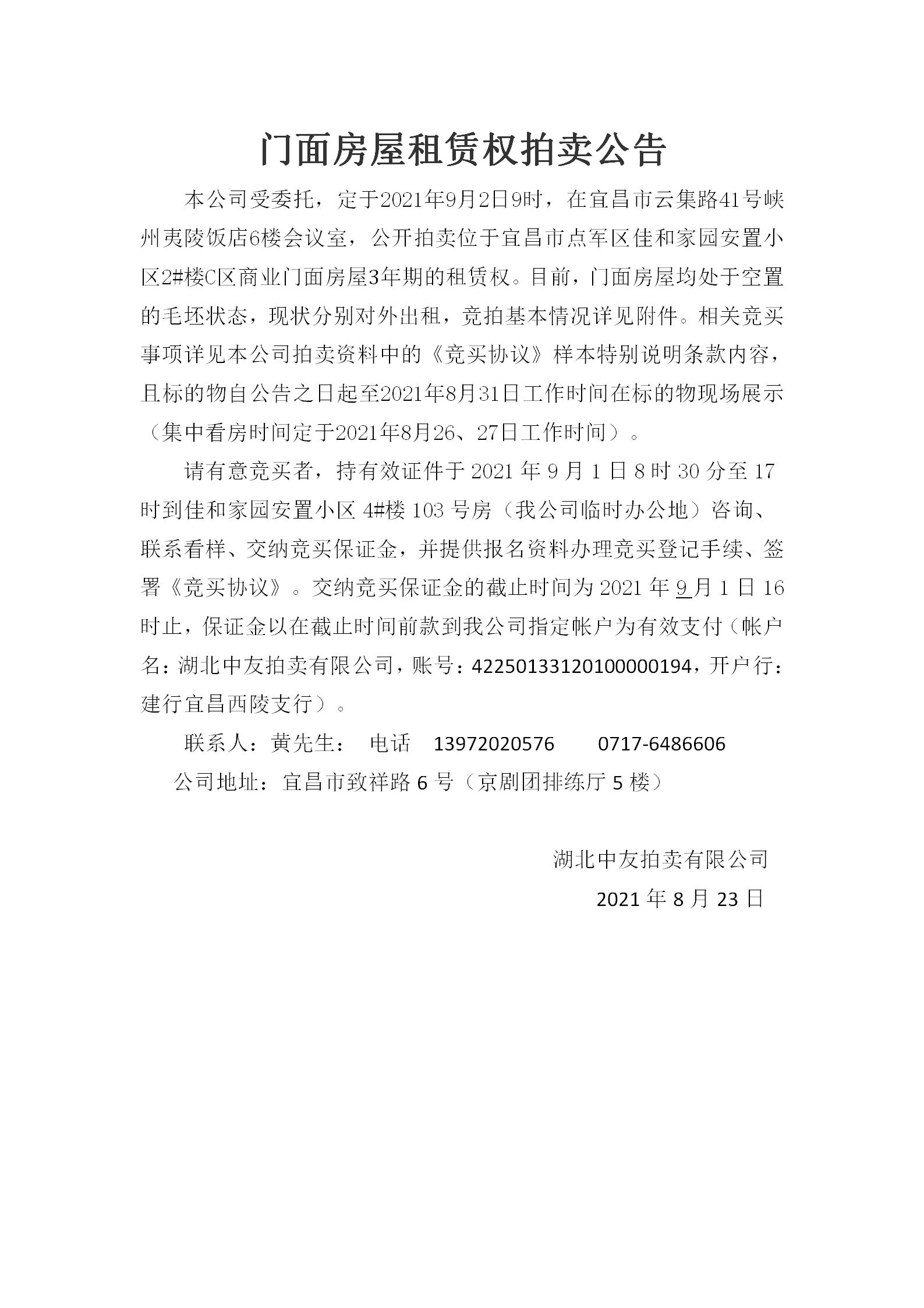 (通訊員周琴、彭曉燕)點(diǎn)軍區(qū)佳和家園安置小區(qū)2#樓C區(qū)商業(yè)門面房屋是點(diǎn)軍區(qū)國資局授權(quán)宜昌點(diǎn)盛投資開發(fā)有限公司經(jīng)營管理的安置房商業(yè)資產(chǎn),目前該項(xiàng)目正在開展租賃權(quán)競拍工作,競拍公告已發(fā)布點(diǎn)軍區(qū)人民政府網(wǎng),現(xiàn)將公告內(nèi)容公布如下: