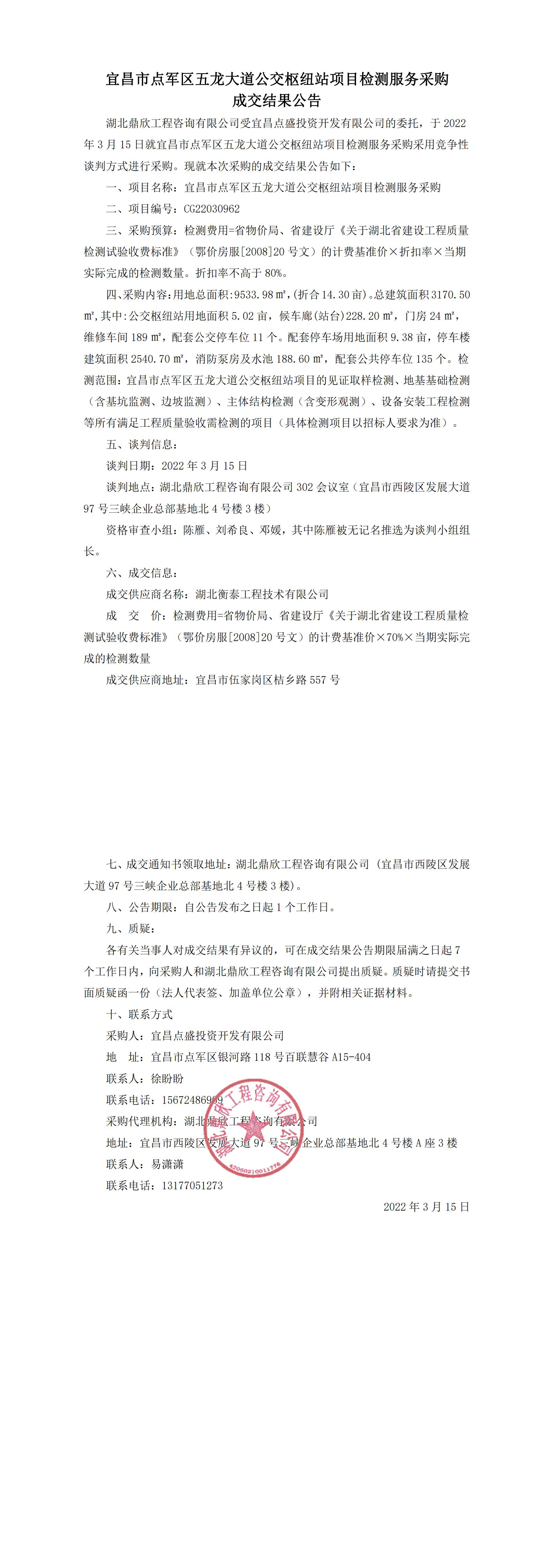 宜昌市點(diǎn)軍區(qū)五龍大道公交樞紐站項(xiàng)目檢測服務(wù)采購結(jié)果公告