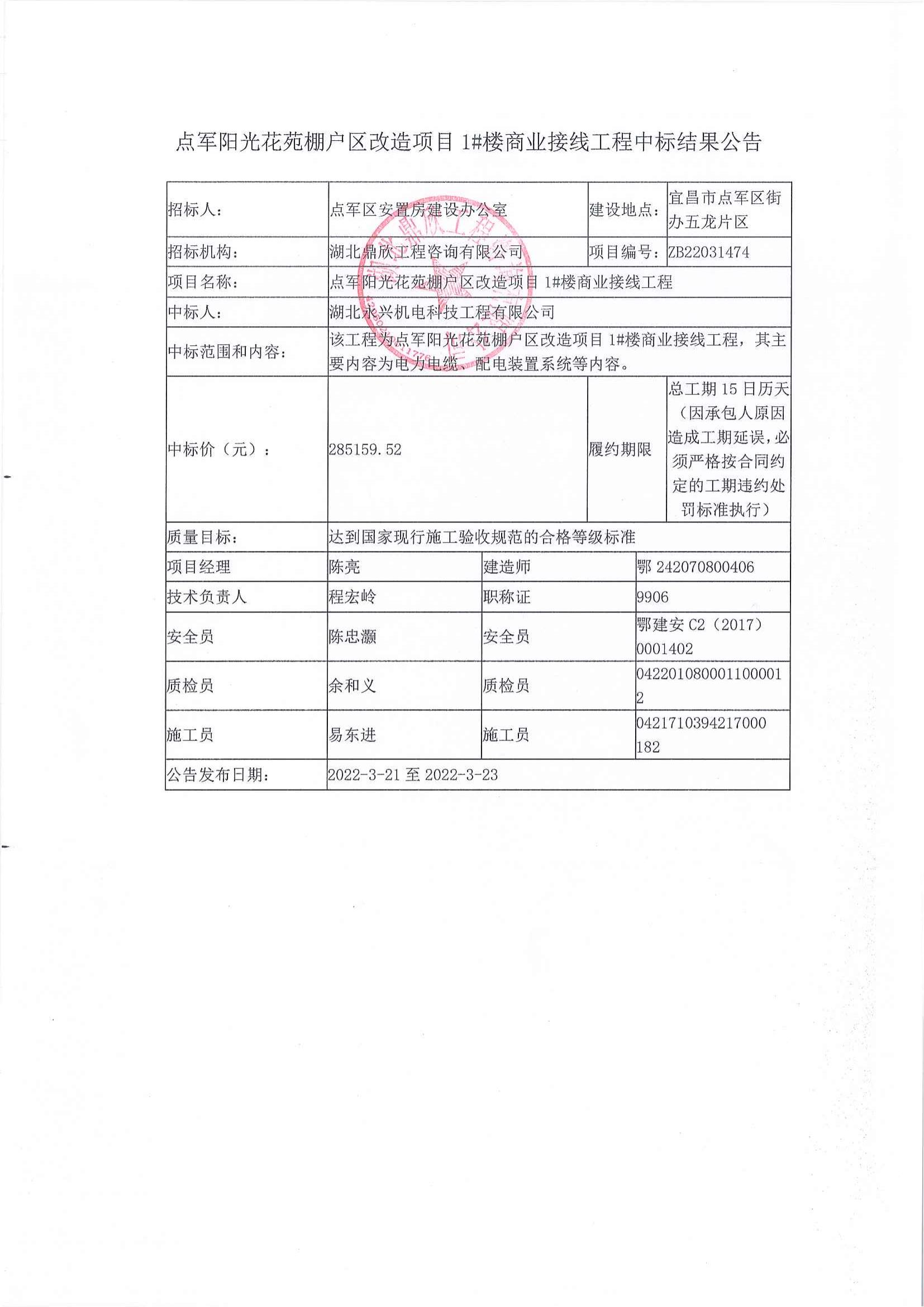 點(diǎn)軍陽(yáng)光花苑棚戶(hù)區(qū)改造項(xiàng)目1#樓商業(yè)接線(xiàn)工程中標(biāo)公告