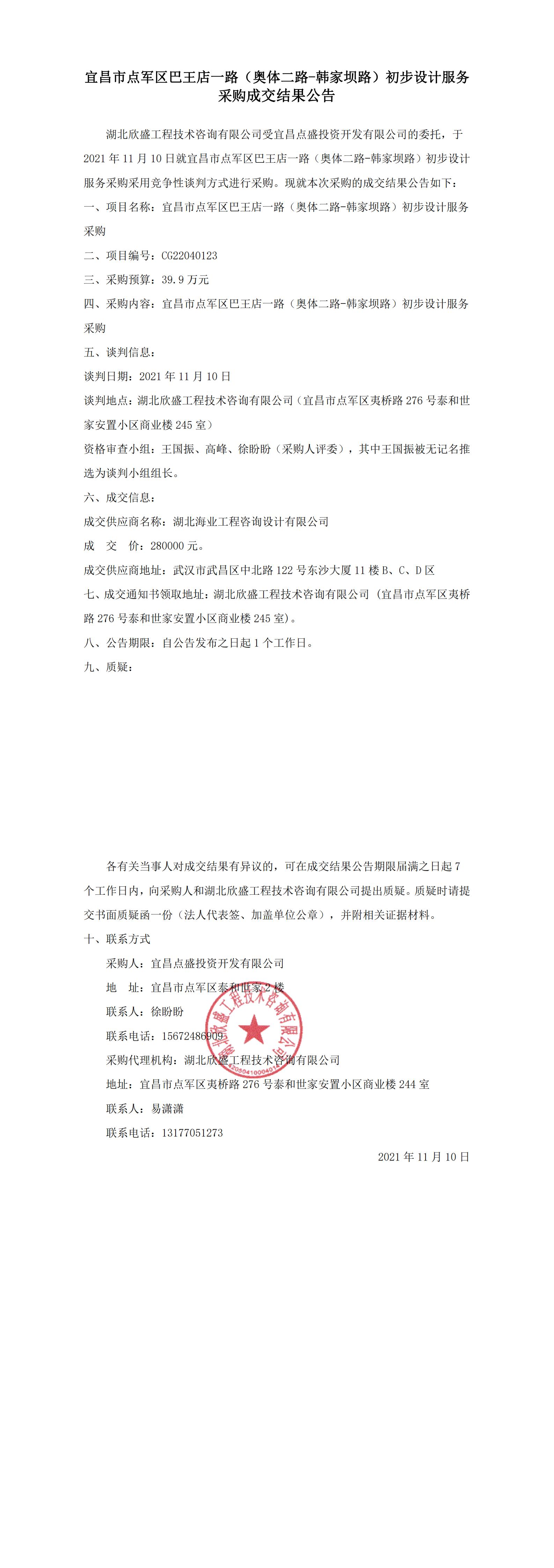 宜昌市點軍區(qū)巴王店一路(奧體二路-韓家壩路)初步設計服務采購成交結果公告