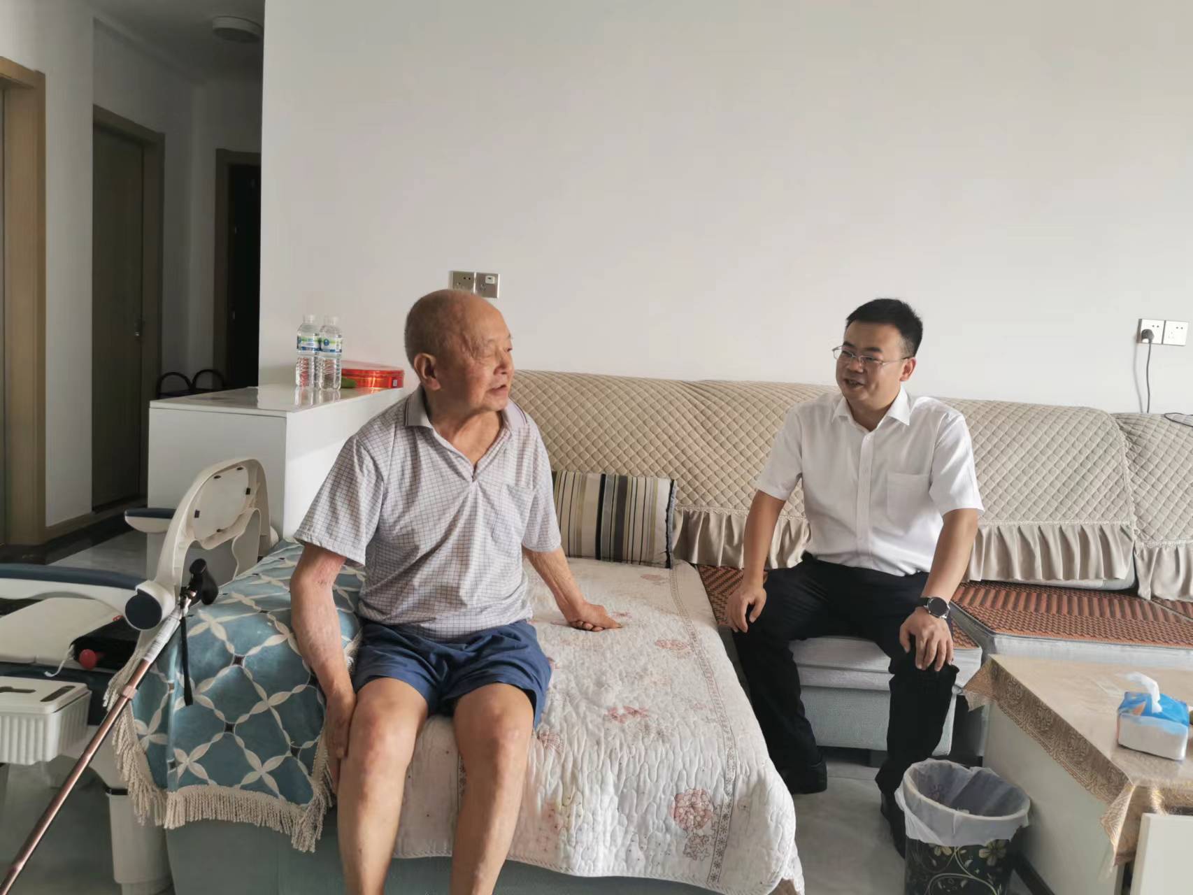 在老黨員劉世松家中,楊濤親切詢問了劉老的身體狀況和生活情況,得知劉老曾在橋邊村委會工作,現(xiàn)已85歲高齡,2018年患中風(fēng)后,腿腳不便,致使出行困難,但仍積極參加橋邊村黨支部活動,為村集體經(jīng)濟(jì)建設(shè)和基層治理建言獻(xiàn)策。