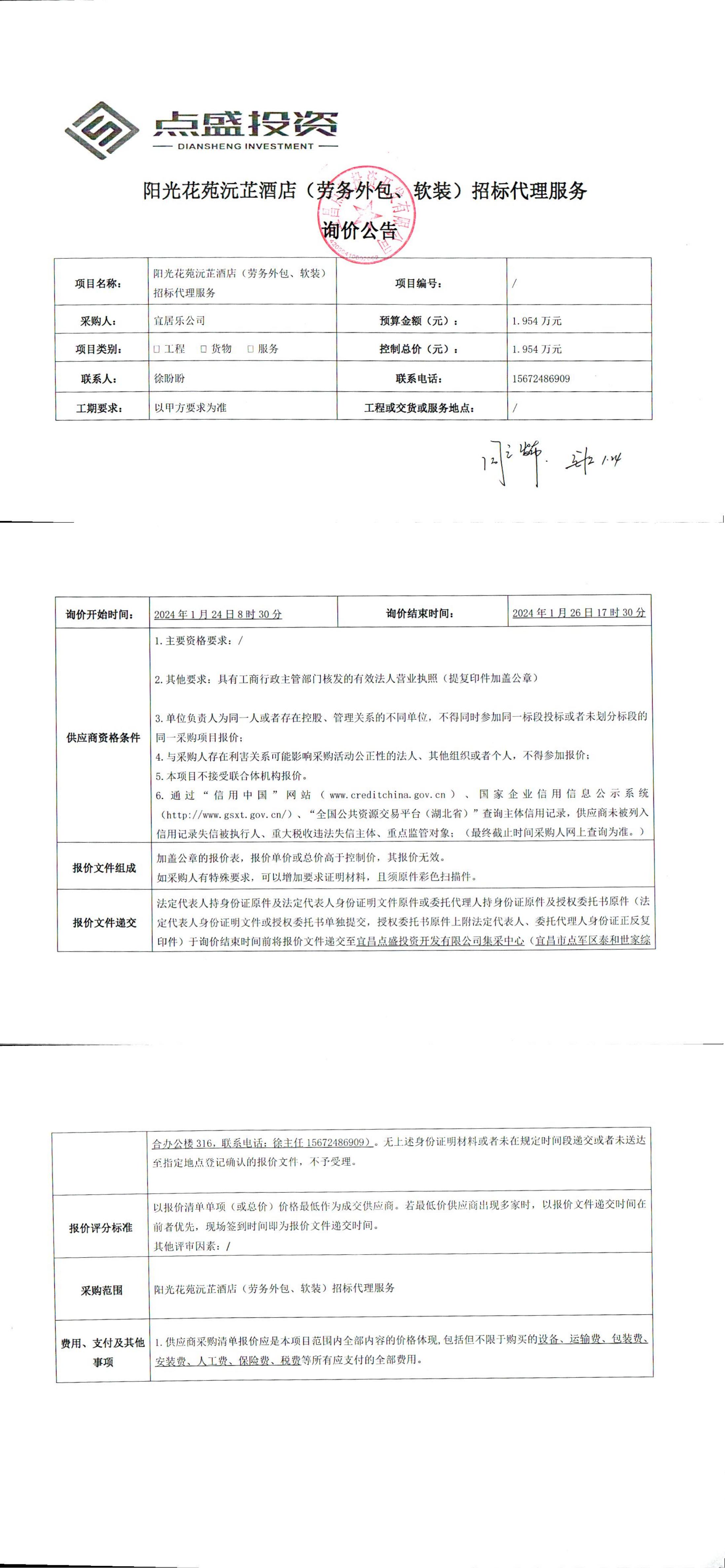 陽光花苑沅芷酒店(勞務(wù)外包、軟裝)招標(biāo)代理服務(wù)?詢價公告