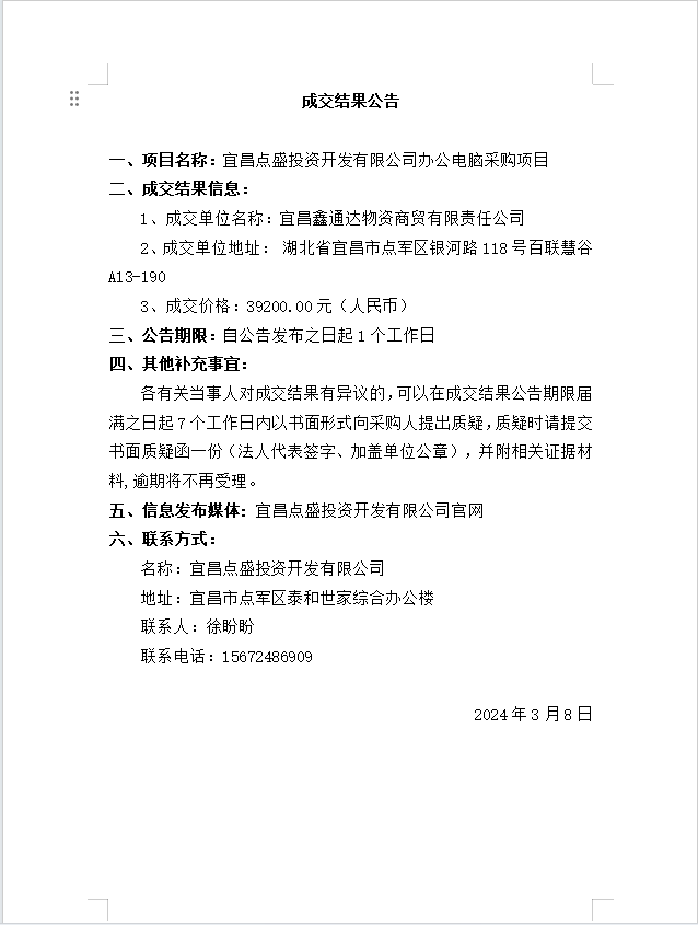 宜昌點(diǎn)盛投資開(kāi)發(fā)有限公司辦公電腦采購(gòu)項(xiàng)目成交公告
