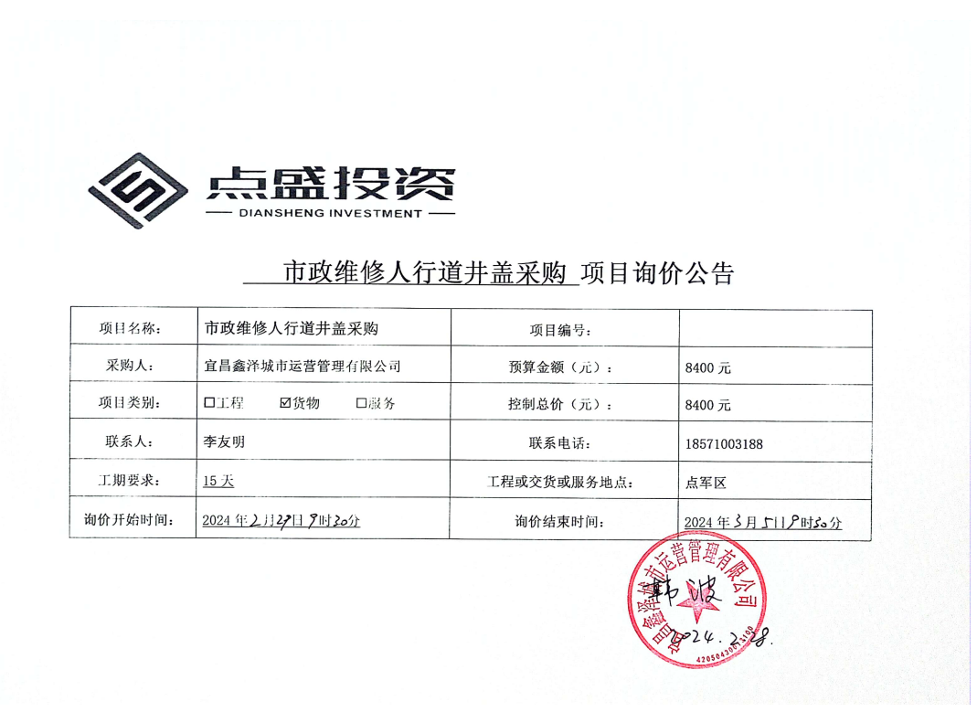 宜昌鑫澤城市運(yùn)營管理有限公司市政維修人行道井蓋采購項(xiàng)目詢價(jià)公告