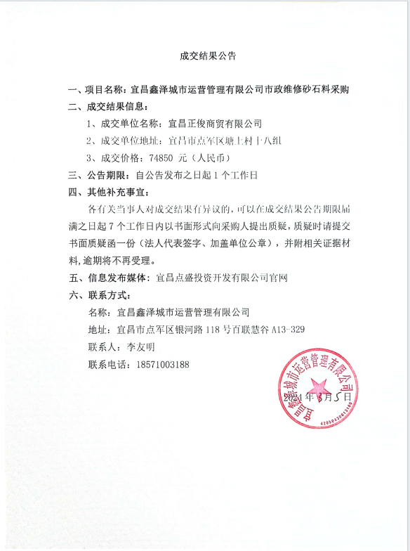 宜昌鑫澤城市運(yùn)營管理有限公司市政維修砂石料采購項(xiàng)目成交公告