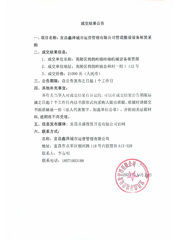 宜昌鑫澤城市運(yùn)營(yíng)管理有限公司管道敷設(shè)設(shè)備租賃采購(gòu)項(xiàng)目