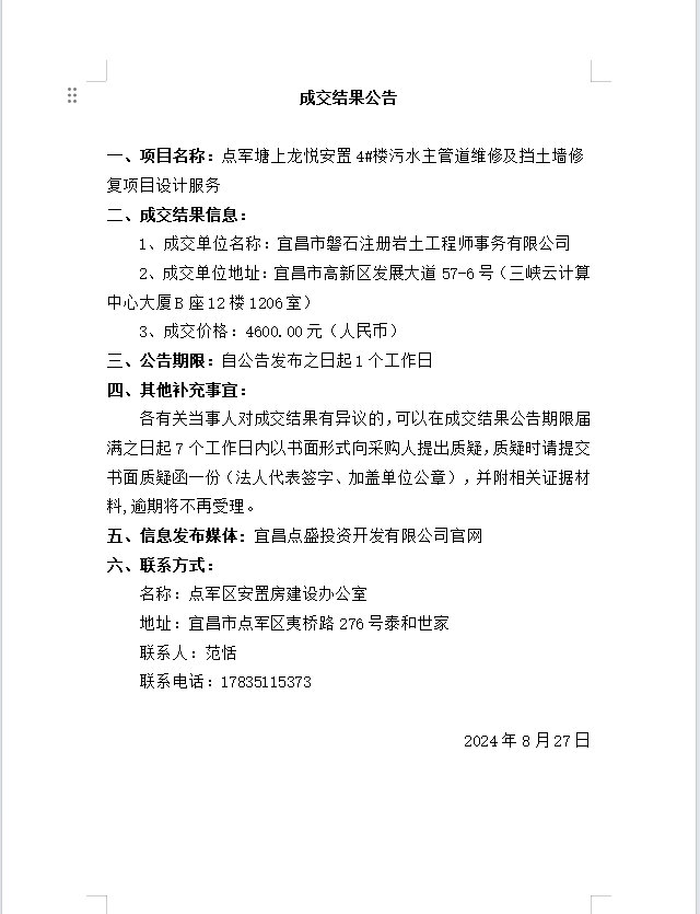 點(diǎn)軍塘上龍悅安置4#樓污水主管道維修及擋土墻修復(fù)項(xiàng)目設(shè)計服務(wù)成交公告