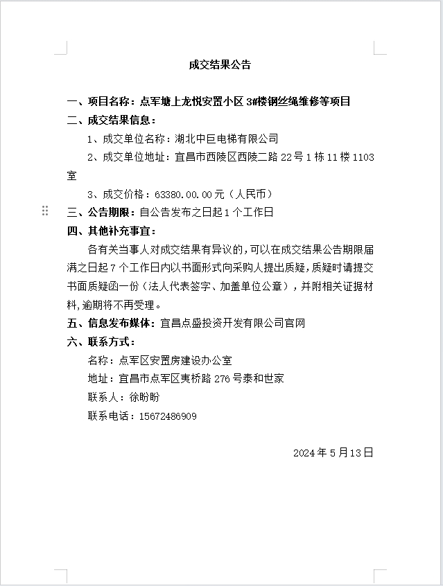 點軍塘上龍悅安置小區(qū)3#樓鋼絲繩維修等項目成交公告
