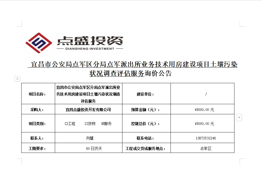 宜昌市公安局點軍區(qū)分局點軍派出所業(yè)務技術用房建設項目土壤污染狀況調查評估服務詢價公告