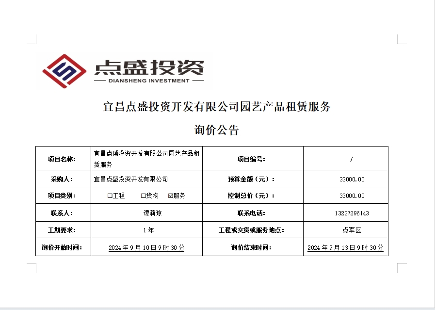 宜昌點盛投資開發(fā)有限公司園藝產(chǎn)品租賃服務詢價公告