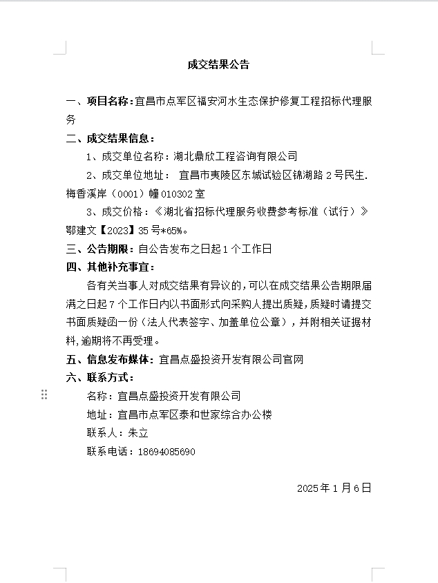 宜昌市點軍區(qū)福安河水生態(tài)保護修復(fù)工程招標(biāo)代理服務(wù)成交公告
